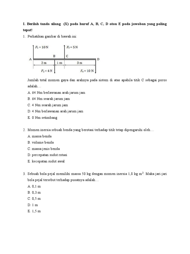 Soal dan jawaban dinamika rotasi dan kesetimbangan benda tegar fisika kelas 11 1. Momen inersia tergantung pada distribusi massa benda relatif terhadap sumbu rotasi benda. Momen inersia sebuah benda yang berotasi terhadap titik tetap dipengaruhi oleh.